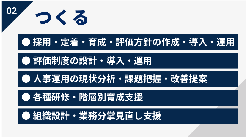 採用・定着・育成・評価の一連の人事運用について制度構築から運用までの一連をサポートいたします。