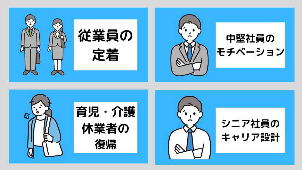 社員が自らの強みや価値観を再発見し、主体的にキャリアを形成できるようサポートすることを通して、エンゲージメントとパフォーマンスの向上を促します。